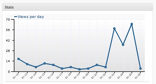 Cryptic eh! Posted on January 26, 2010January 26, 2010 by Ben Trigg This was my what the blog stat looked like today… Who is M??? I think Someone is speaking to me…. Share this: Click to share on X (Opens in new window) X Click to share on Facebook (Opens in new window) Facebook Click to share on Pocket (Opens in new window) Pocket Click to share on Pinterest (Opens in new window) Pinterest Click to email a link to a friend (Opens in new window) Email Like Loading...